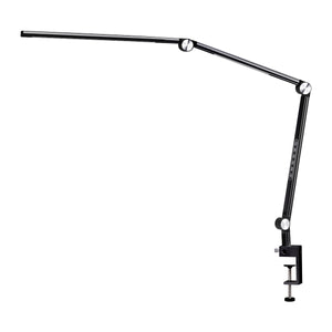 Med sin enkle aluminiumsform i en sort mat finish, imponerer lampen med et futuristisk look, som passer perfekt ind i næsten ethvert interiør. Takket være det skruestik-lignende håndtag kan den nemt og stabilt monteres på et bord, og det 135 cm høje stativ sikrer passende funktionalitet. Lampens glatte overflade gør den usædvanligt nem at holde ren, hvilket eliminerer problemer med svært tilgængelige elementer.